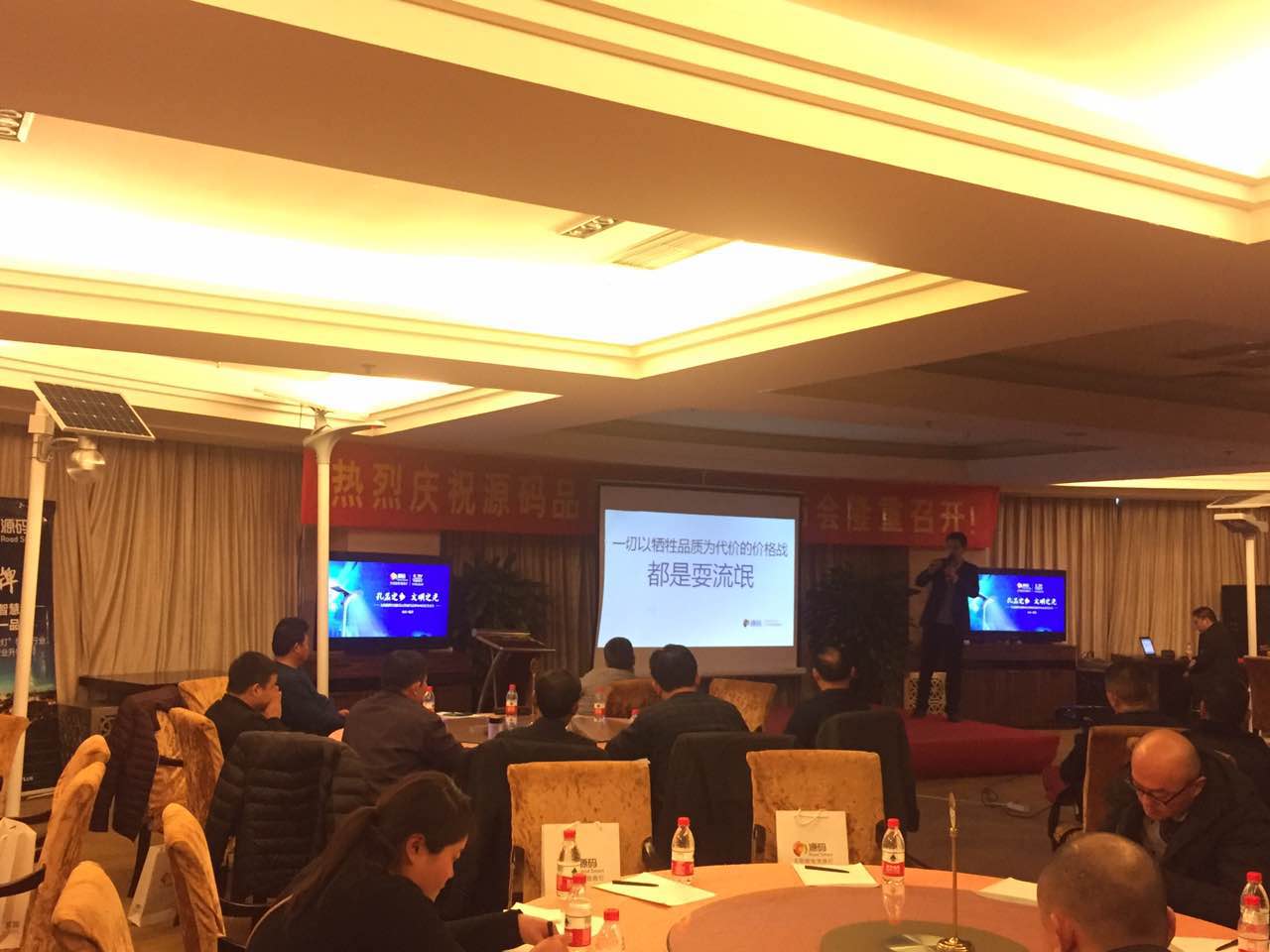 會上,出生于山東的源碼總經理王總在發表致辭中感慨萬分!王總內心深處忘不了的故鄉情,總是有著太多的牽掛和念想。王總表示:山東是他夢開始的地方,在以后,源碼將不忘初心,堅持創新堅持做高品質產品來回報山東人民,讓更多的源碼太陽能智慧路燈照亮山東人民的幸福之路。同時王總也對整個太陽能路燈行業的發展趨勢作了詳細的講解,表示未來太陽能路燈的發展方向一定是向核心配件升級、工業美學設計引入以及高智能化技術應用這幾方面發展。