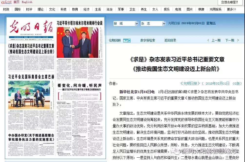 文章強調,新時代推進生態文明建設,要堅持人與自然和諧共生,堅決打好污染防治攻堅戰,要加快構建生態文明體系,全面推動綠色發展,把解決突出生態環境問題作為民生優先領域,有效防范生態環境風險,加快推進生態文明體制改革落地見效,提高環境治理水平。